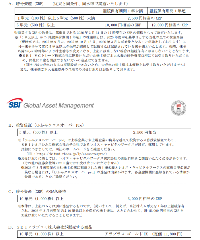 500株を1年以上継続保有でXRP12000円分貰えるようになります。